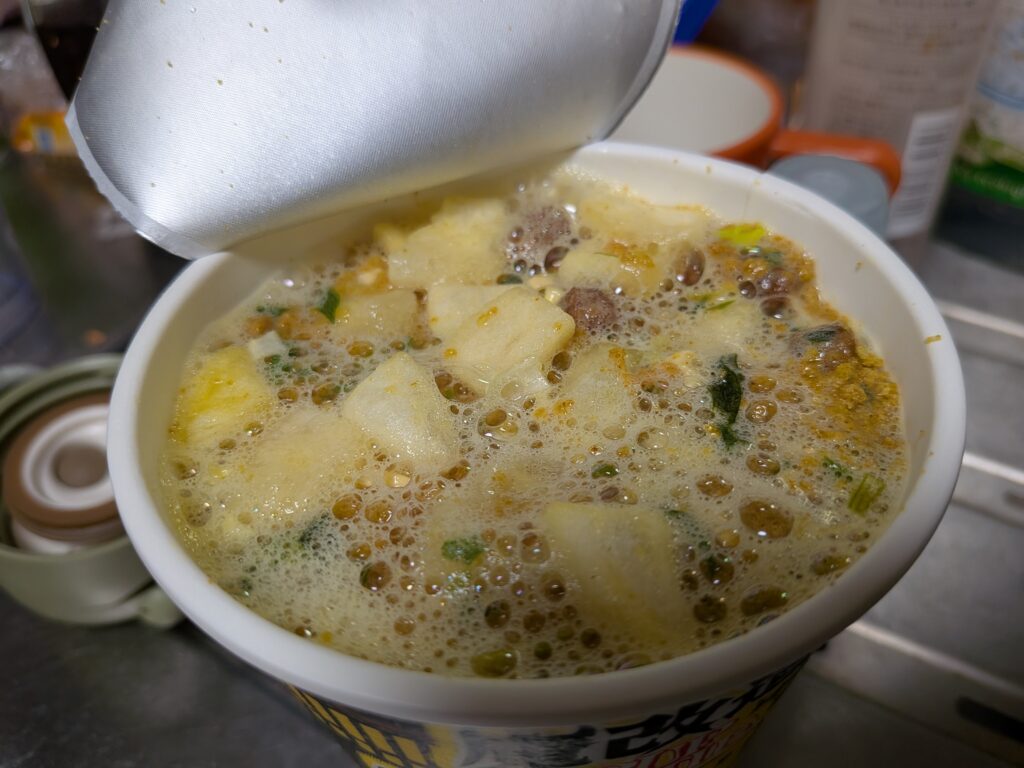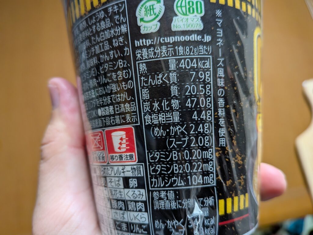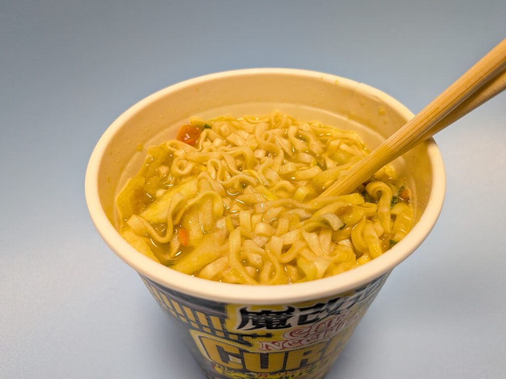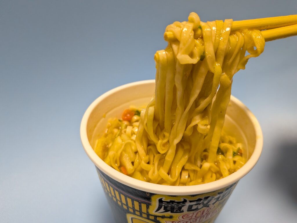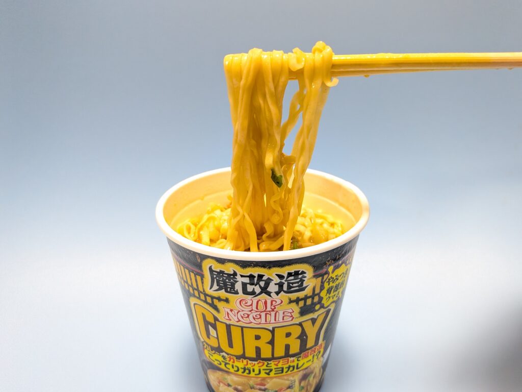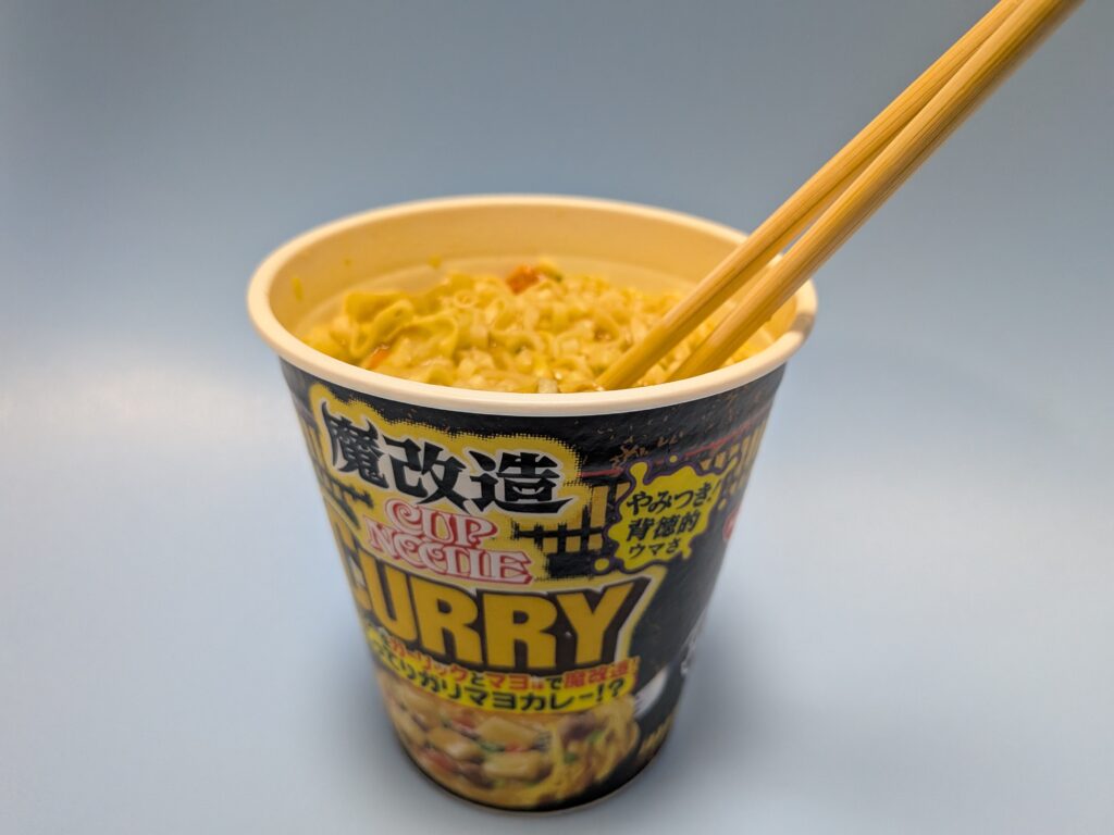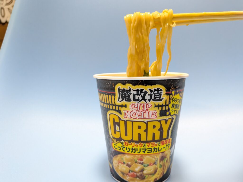 ↑さてそして肝心の魔改造カップヌードルのこってりガリマヨカレーのお味はと言いますと、しっかりガーリックとマヨネーズの風味が感じられる、まさに魔改造と言ったパンチのある味でした(#^^#)