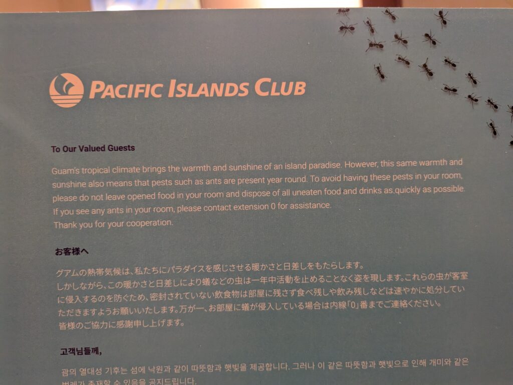 ↑筆者が宿泊したPICグアムの【お客様へ】というメッセージが書かれたカードにも記載されておりましたが、記載されている文章によると、客室の利用状況によっては室内にも蟻が侵入する可能性がある事を示唆しております。