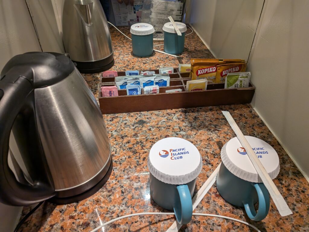 ↑その下にはケトルやマグカップ、コーヒーやお茶のパックなど。
