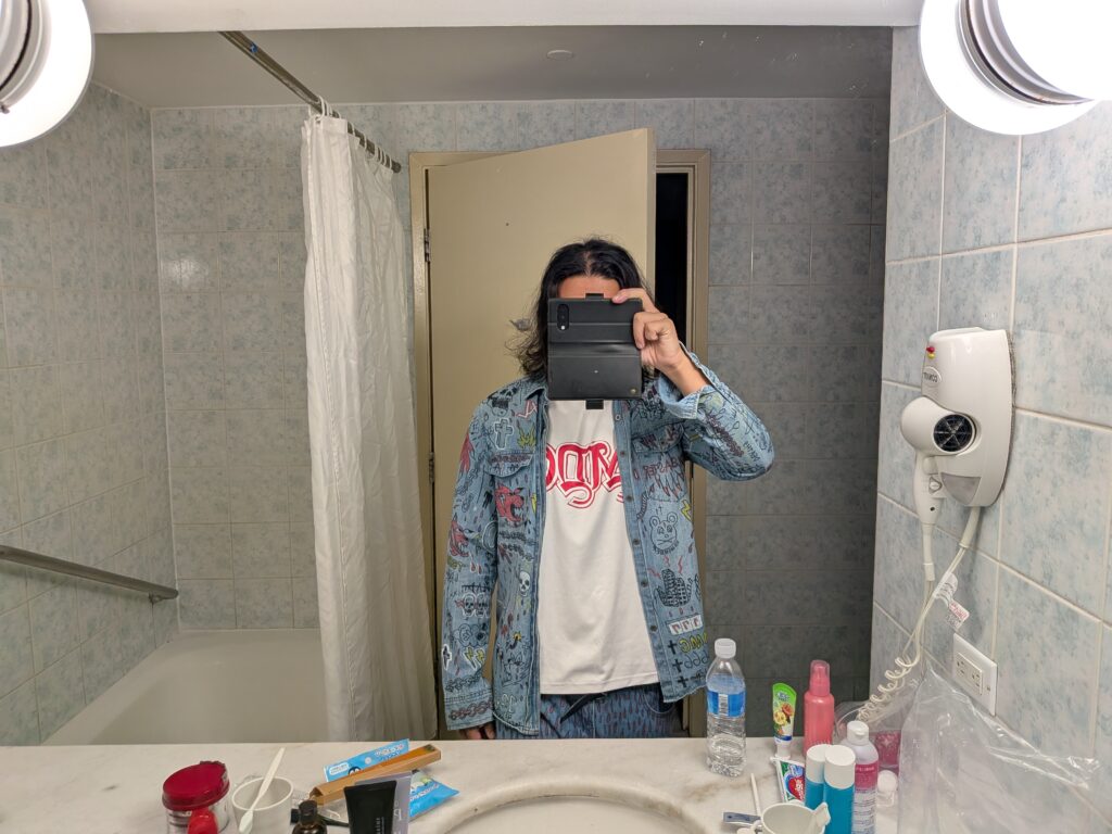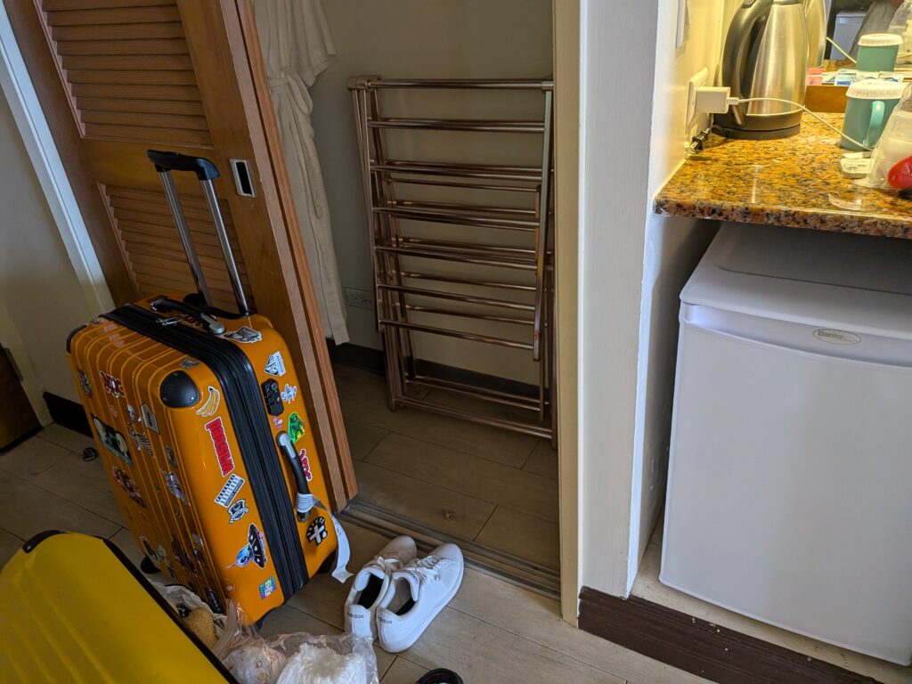 余談ですが夜寝るときクーラーを切っても客室が寒すぎて、行きに機内で着てた長袖長ズボンを着て寝たのでこんな服装をしています(笑)