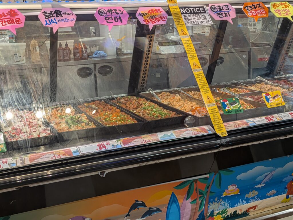 新鮮なマグロやサーモン、海老やカニなどの魚介類がディスプレイされており、妻も私もかなり迷ってしまいました。