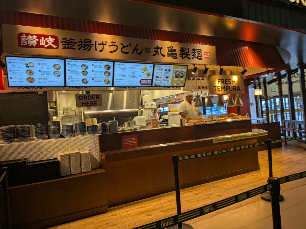 記事冒頭で触れた丸亀製麵さんはフードコートのテーブル群からは少し離れた位置にありました。