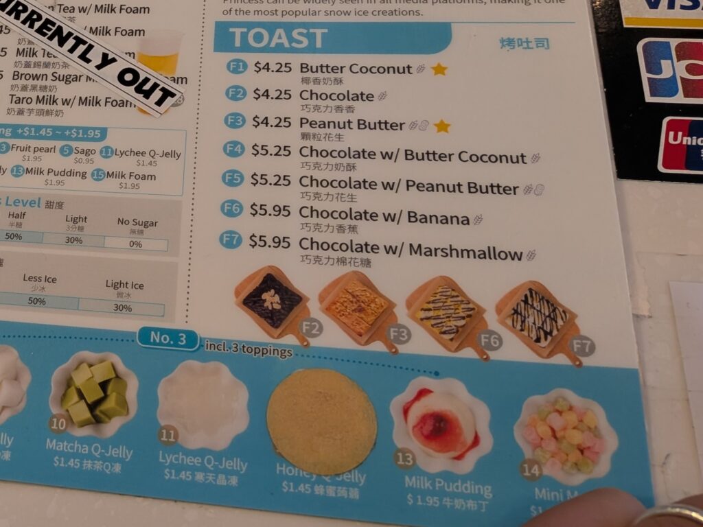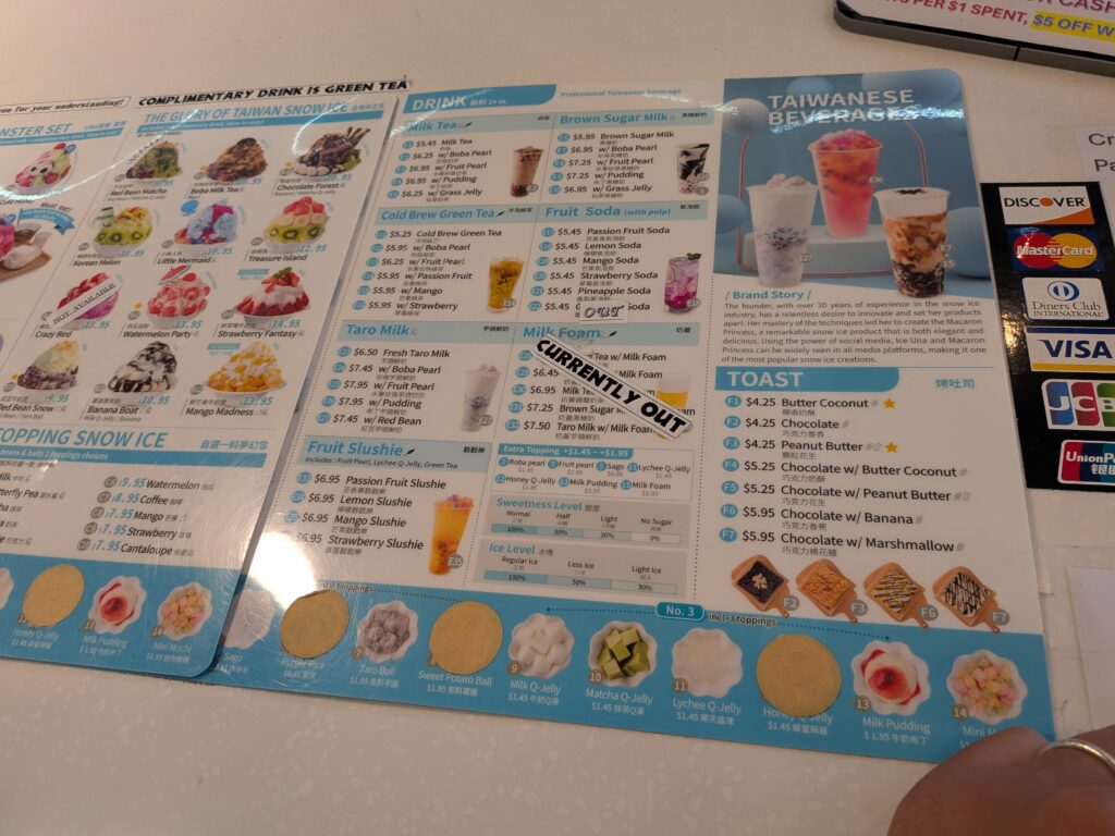 お店の看板には大きく TAIWAN SNOW ICE CAFÉ と書かれており、右には中国語で 雪花冰(シュエホワビン) の文字。