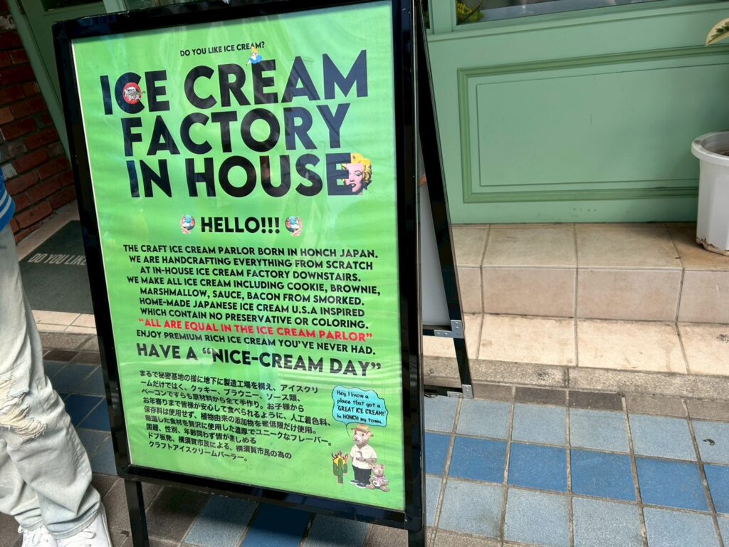 ミリオンダラーアイスクリームパーラーの置き看板には以下のように記載されている。