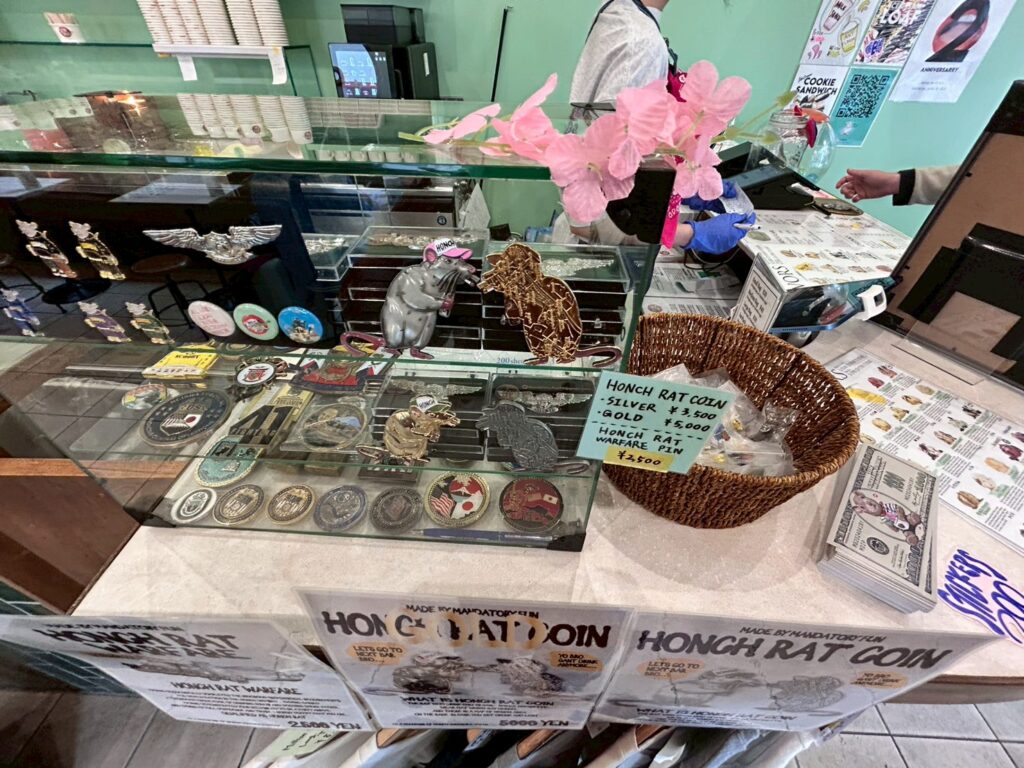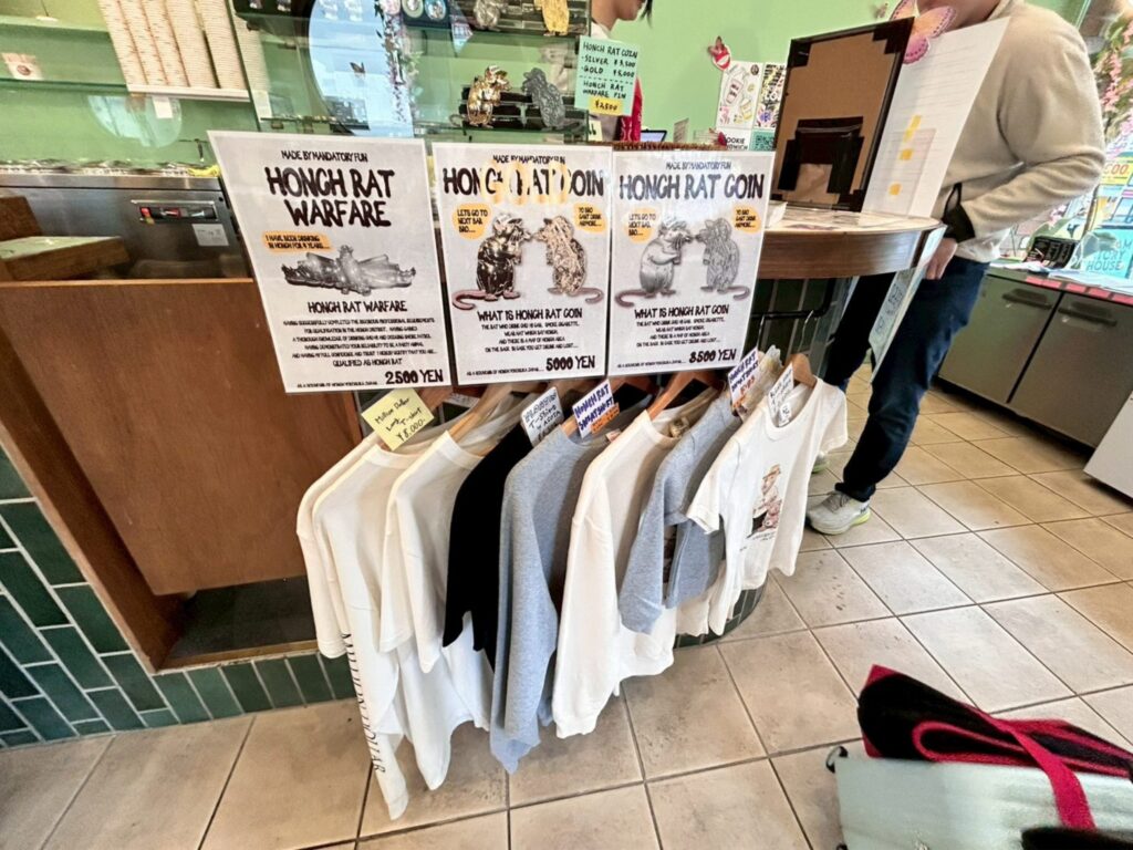 HONCH RAT(ハンチラット)というオリジナルキャラクターのようで、横須賀のドブ板通りを飲み歩くキャラクターらしい。Million Dollar Ice Cream Parlor(ミリオンダラーアイスクリームパーラー)のファンだけではなく、横須賀好きの方にもオススメのキャラクターとなっております。