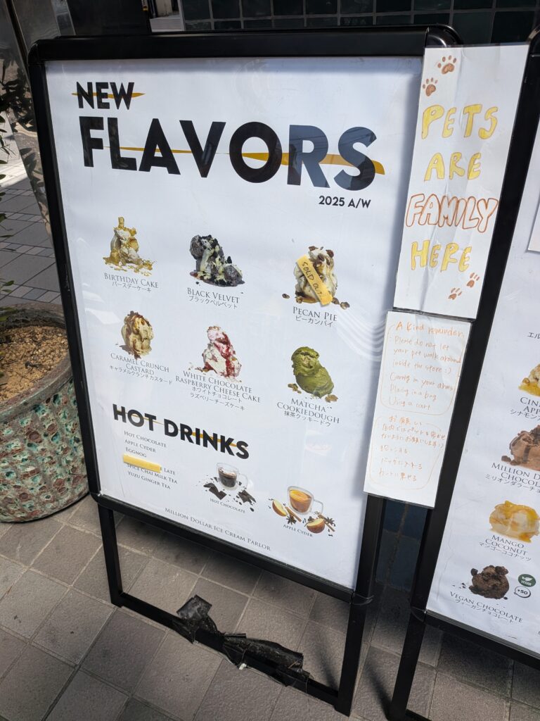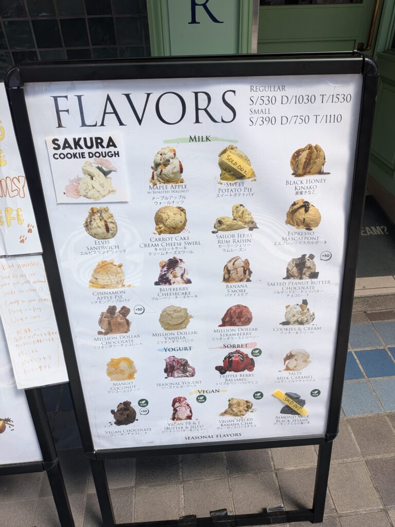 Million Dollar Ice Cream Parlor(ミリオンダラーアイスクリームパーラー)のアイスクリームフレーバーはとても種類豊富で、外にある看板を見ているだけで甘い物好きならワクワクしてしまう事必至。