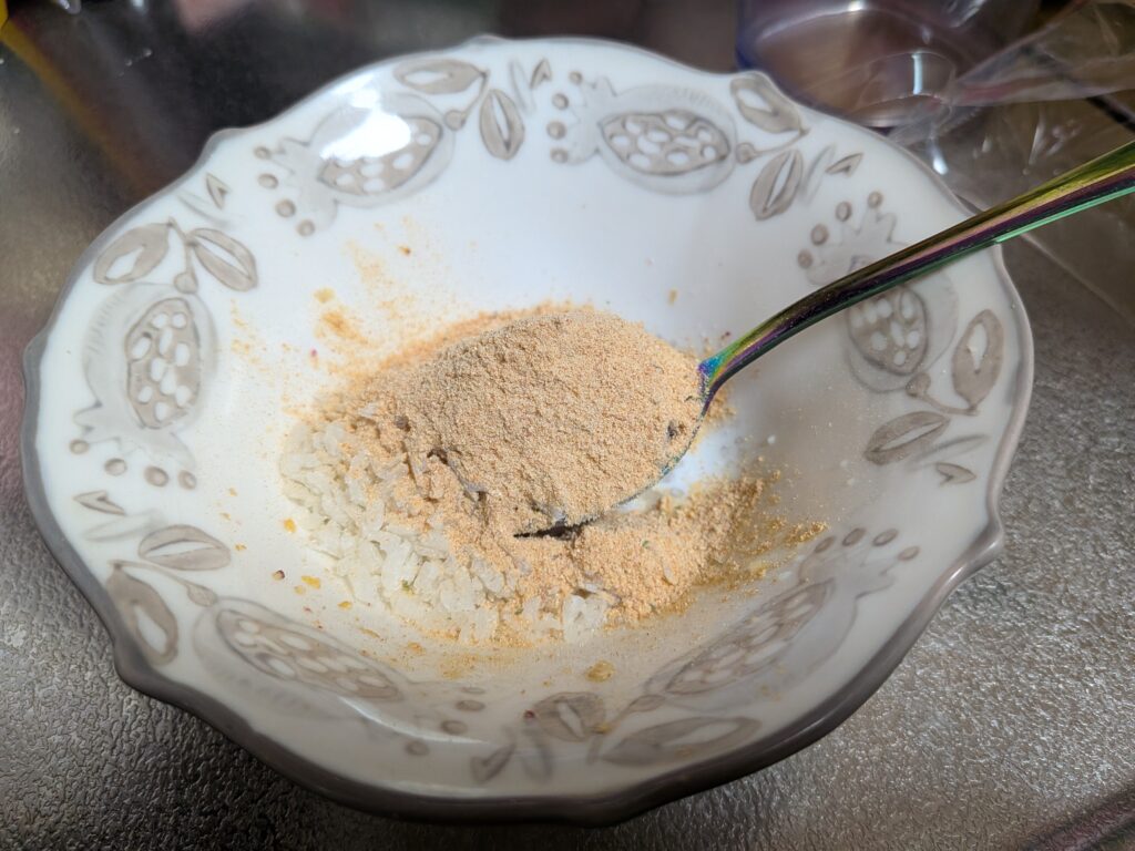 乾燥した米とスープの粉を器に入れて、お湯を注ぐだけという手軽さ。